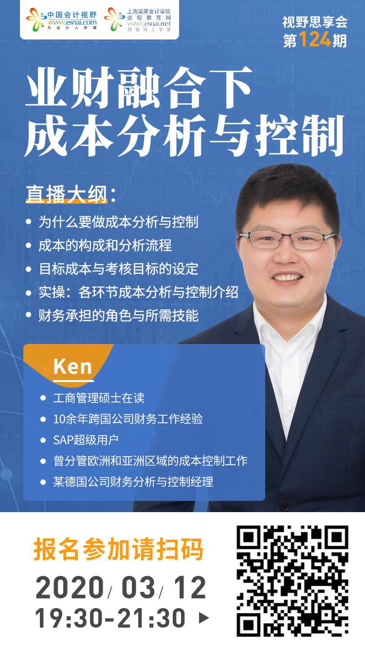 本帖最后由 无忧草 于 2020-3-4 13:54 编辑 分享内容:1.为什么要做成本分析与控制?2.成本的构成和分析流程3.目标成本的与考核目标的设定4.实操:各环节成本分析与控制介绍5.财务承担的角色与所需技能特邀嘉宾: ...