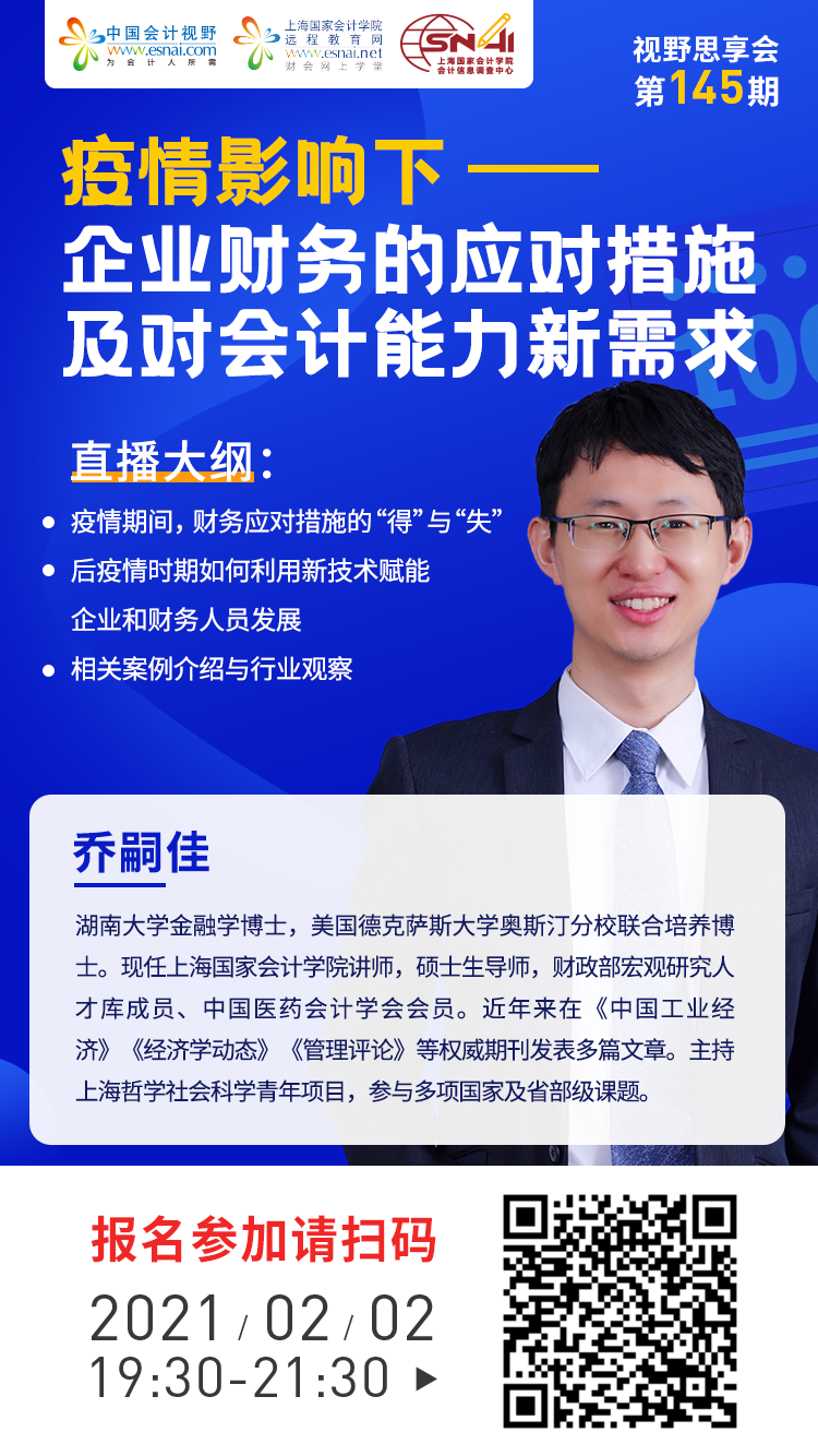 课程安排 直播主题:疫情影响下,企业财务的应对措施及对会计能力新需求 直播日期:2021年2月2日 直播时间:19:30-21:00 直播嘉宾:乔嗣佳 ...